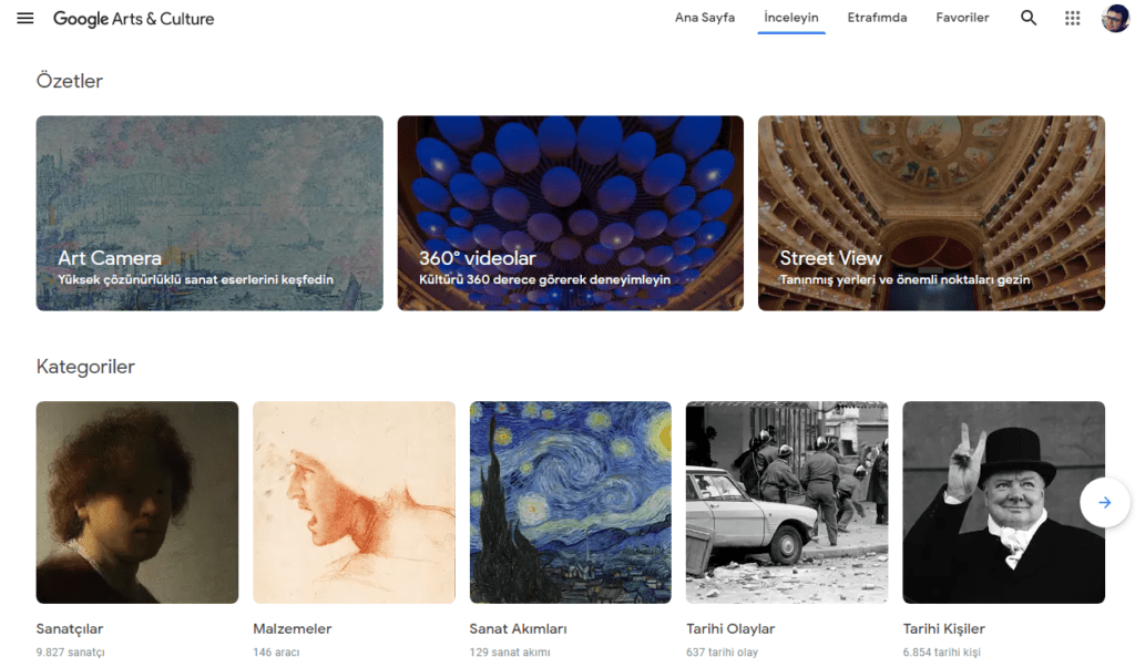 Dünyanın çeşitli müzelerini online gezip, resim ve heykel gibi sanat eserlerini yüksek çözünürlüklü görüntüleyebiliyorsunuz. Mobil uygulamasıyla merak ettiğiniz sanat eserini taratarak o eser hakkında ayrıntılı bilgi de edinebilirsiniz. Sanatçı sayfasından sanatçı hakkında bilgi edinebilir, sanatçının eserlerini yapılma zamanına ya da renk paletine göre de sıralayabilirsiniz. Ayrıca https://experiments.withgoogle.com/collection/arts-culture adresinden de farklı deneyimler sunan projelere göz atabilirsiniz.  Bunun yanında çektiğiniz bir fotoğrafı sanat eserine dönüştürebilir ya da çektiğiniz bir selfie ile sanat eserlerinde en çok kime benzediğinizi de görebilirsiniz.  Şuan için tam olarak Türkçe dil desteği bulunmamaktadır. Ancak metinlerin bulunduğu yerlerde Google çeviri ile çeviri yapabilirsiniz.