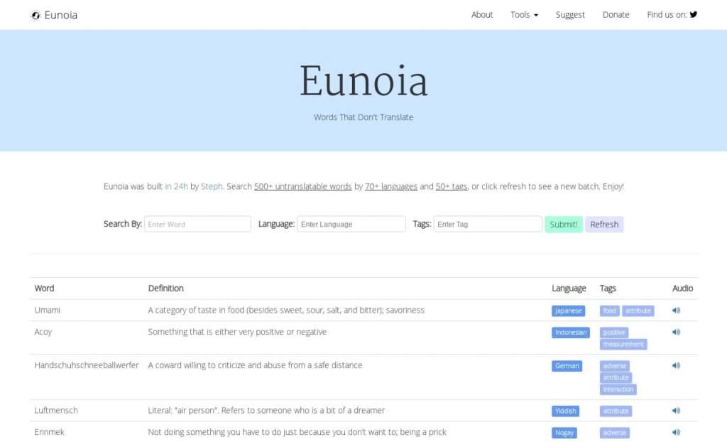 İyi niyet, güzel düşünme anlamına gelen Eunoia kelimesinden adını alan web sitesi başka dillerde tam karşılığı olmayan yüzlerce kelime içermektedir. Eunoia aslında Steph Smith tarafından 24 saatlik bir startup yarışması için geliştirildi. Bu yarışmada beşinci oldu ve Product Hunt tarafından günün 2.si seçildi.