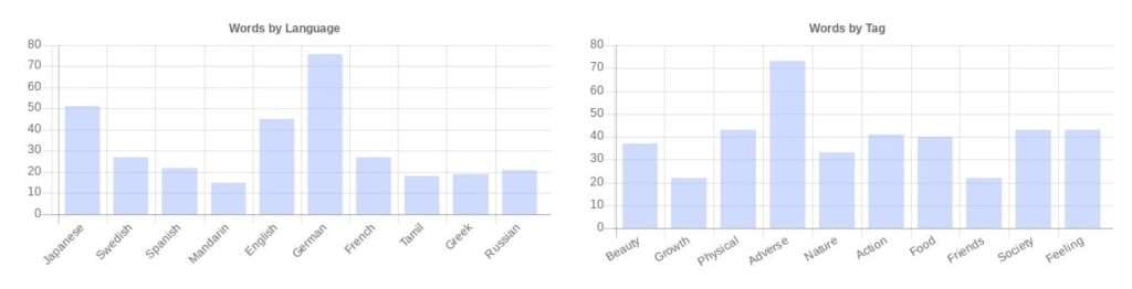 Şuan için 50 den fazla dilde 500 den fazla kelime mevut. 76 kelimeyle en fazla kelime Almanca ve muhtemelen birinciliğini kaptırmayacaktır. Dil meraklıları için güzel bir kaynak olacağını düşünüyorum.