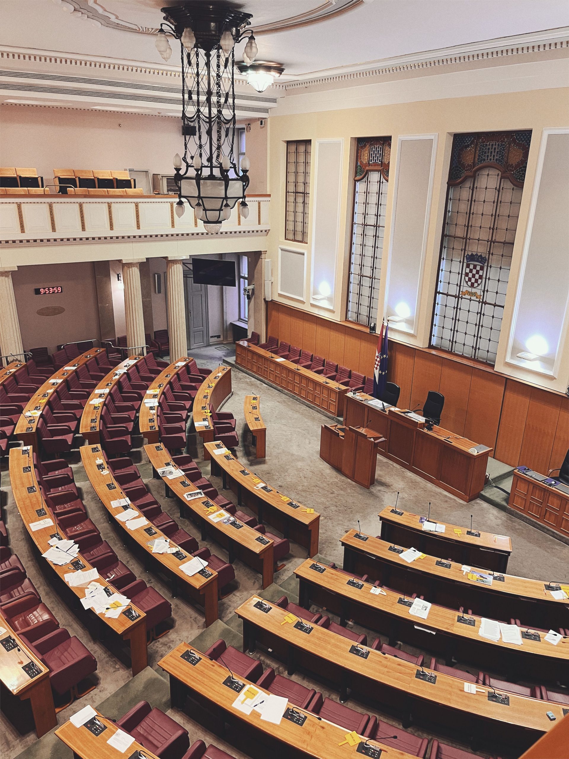 Proje kapsamında Hırvat Parlamento Binasını ziyaret ettik, küçük bir binaya sahip olan bu yer, pek çok devlet işlerinin de görüldüğü alan olarak hizmet veriyor. Avrupa Birliği’ne geçişten sonra yenilikler yaparak uyum çalışmaları tamamlanmış. Duvarlardaki yıkık alanlar ve dökülen alçılar dikkatimizi çekiyor ve sorduğumuzda 6.4 şiddetindeki 2020 Petrinja depreminden şehirdeki pek çok binanın yanı sıra parlamento binasın da etkilenmiş olduğunu öğreniyoruz.